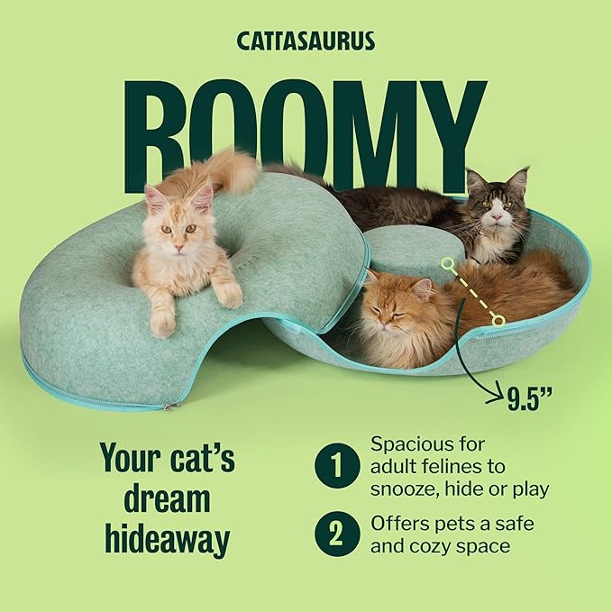 - Durable & Cat-Friendly Design: The Cattasaurus Peekaboo Cat Cave is made from non-toxic, odor-resistant felt that's built to last. It resists pilling and supports safe scratching - perfect as a cat tunnel bed, cat bed cave, or cat scratcher bed. Ideal for all seasons, it offers a snug cat donut bed up top and a comfy cat tunnel below.