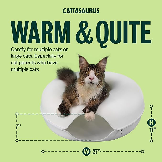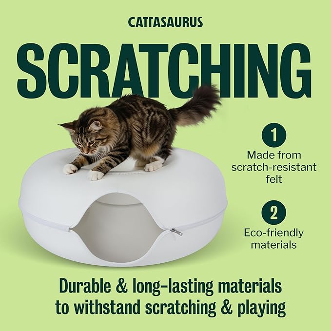 - Durable & Cat-Friendly Design: The Cattasaurus Peekaboo Cat Cave is made from non-toxic, odor-resistant felt that's built to last. It resists pilling and supports safe scratching - perfect as a cat tunnel bed, cat bed cave, or cat scratcher bed. Ideal for all seasons, it offers a snug cat donut bed up top and a comfy cat tunnel below.